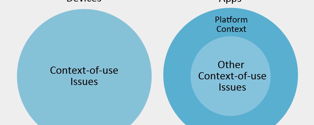Designing for an existing platform, such as an Android smartphone with an existing operating system, immediately narrows down the range of context of use issues and thus already solves a piece of the overall design task. An existing platform, whether it’s an Android phone or a MAC desktop, is by definition a context of use. Designing a product for an existing platform means that some piece of the design task has already been pre-solved for you.