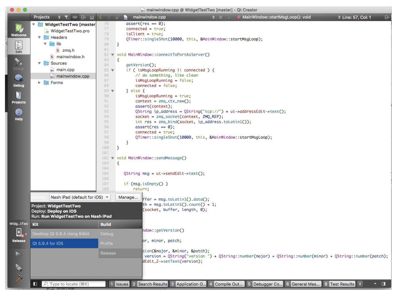 In this example we answered a very important question: does ZeroMQ work with Qt on iOS? Yes, it runs as Request side or as Reply side. It is cross-platform so the same source code builds and runs on MacOS and iOS (and on Linux  with a Linux-specific library).
