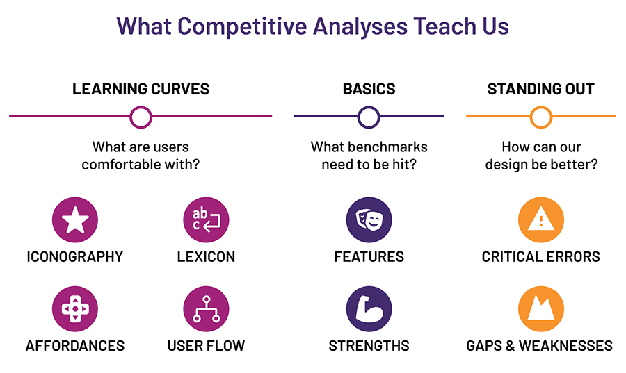 This is not intended to allow designers to simply parrot a competitor’s design, but rather to inform the strategy. This exploration may allow designers to facilitate gentle learning curves for users switching products and ensure that the standard features users expect are included in the product’s design. It also allows designers to identify ways to help the product and brand stand out among the competition by solving shortcomings or major oversights of other products in the market.