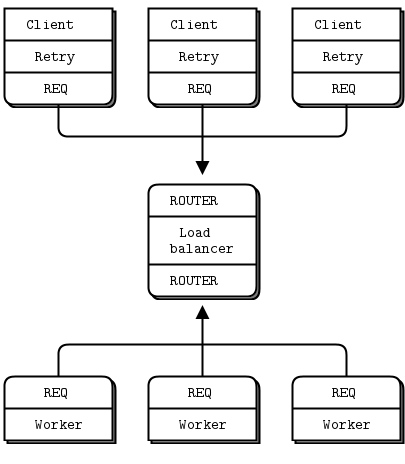 The basis for the queue proxy is the load balancing broker. We already have a retry mechanism in the client, we can use the same approach to handle dead or blocked workers. So using the load balancing pattern will work pretty well. This fits with ZeroMQ's philosophy that we can extend a peer-to-peer pattern like Request Reply by plugging naive proxies in the middle. Besides, we can use the same client we discussed in Lazy Pirate pattern. However worker uses Request socket in this case and not Reply socket as in previous.