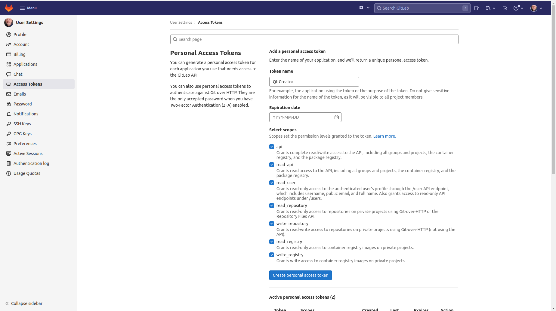 Generate a new access token by entering a suitable Token name (e.g. Qt Creator). Select an expiration date if desired, and check all of the boxes under Select scopes.