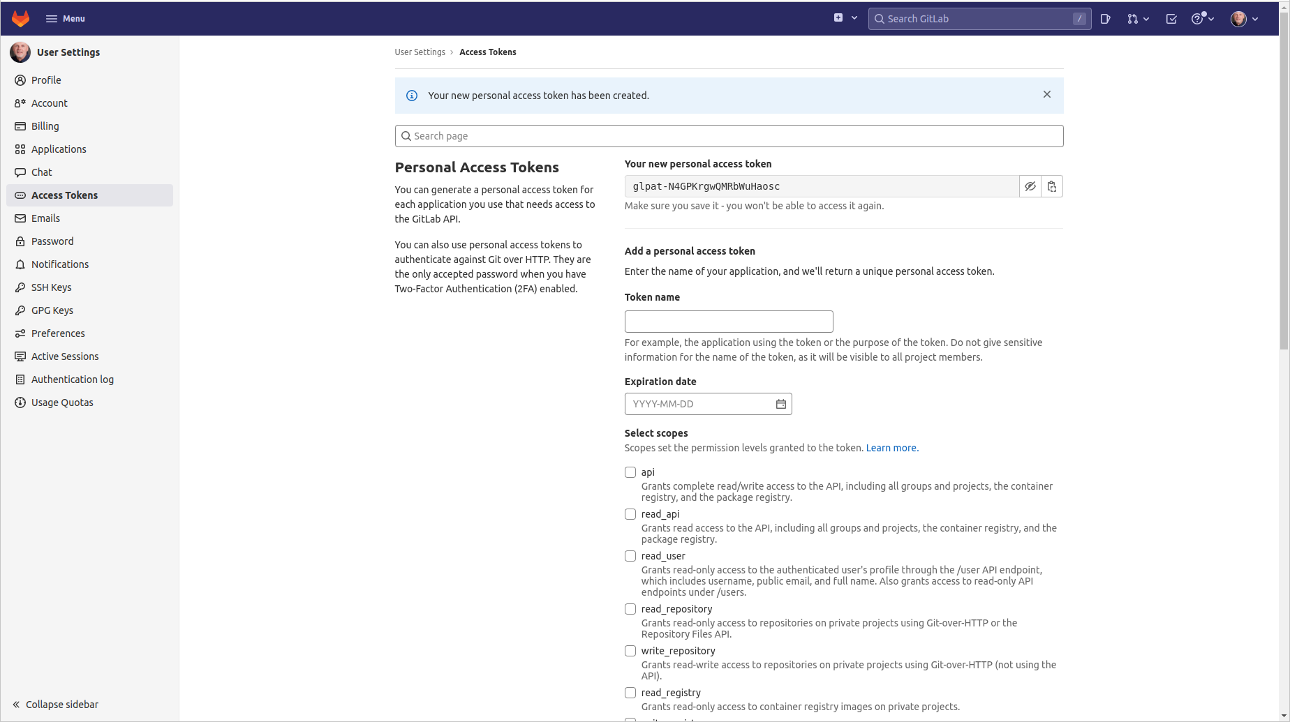 Click on Create personal access token. The UI will give an access token string which you will need in the next step when you configure the Qt Creator gitlab plugin.