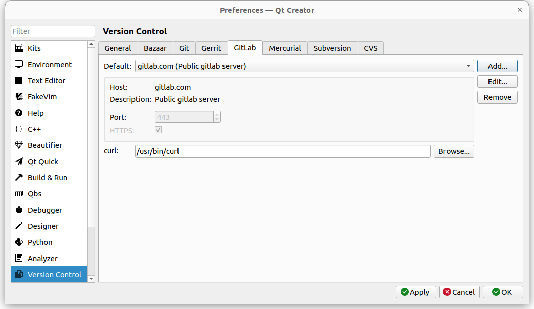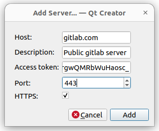 To configure the Qt Creator plugin, go to Edit / Preferences..., select Version Control from the left tab, then GitLab from the top tab. Click on Add... Fill in the values for your gitlab server, as below but using suitable values for the gitlab server you use. Paste in the access token you received from gitlab.