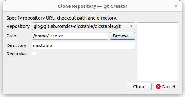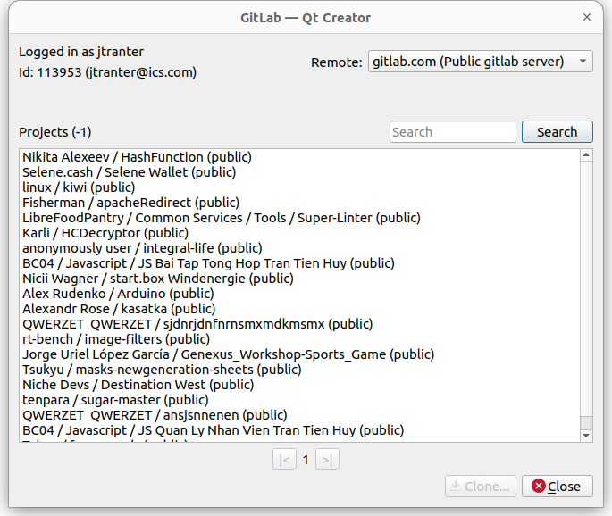 To use the plugin, click Qt Creator, select Tools / Gitlab... and select the server from the Remote: combo box. Within a few seconds, a list of the gitlab projects found on the server should appear: