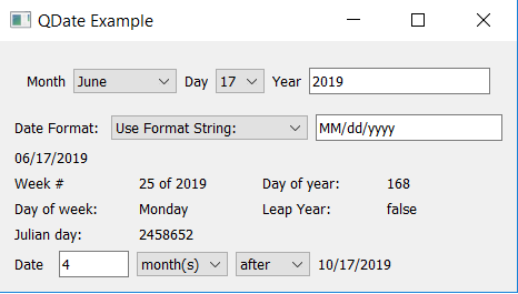 We’ll go over selections of code from the example as we examine QDate. You can download the example project here Zip files for sample code of QDate