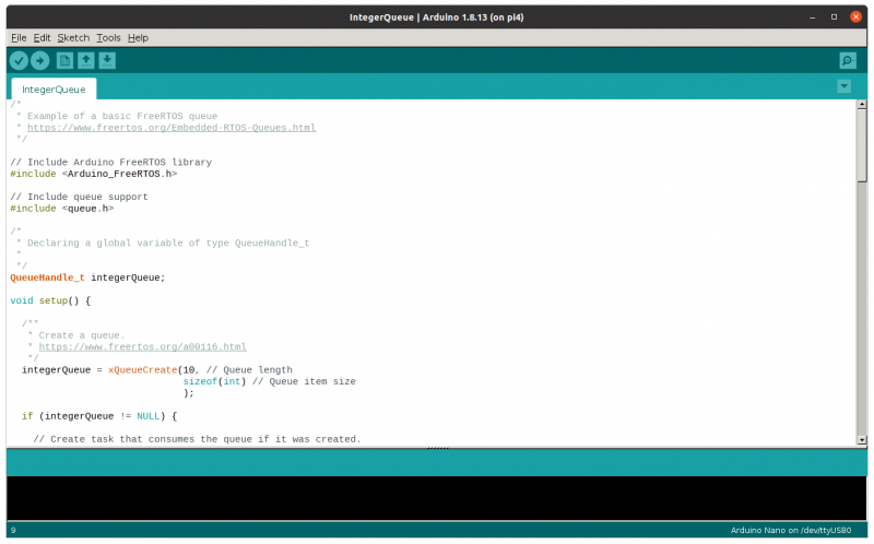 Earlier I showed a code example that used the port of FreeRTOS to the Arduino platform. Arduino is a family of low-cost microcontrollers mostly aimed at hobbyists and non-professional programmers. FreeRTOS is available directly from the Arduino IDE and includes a number of example programs.