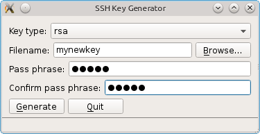 The UI prompts the user for the key type, the file name of the private key to generate and an optional pass phrase, which needs to be confirmed.