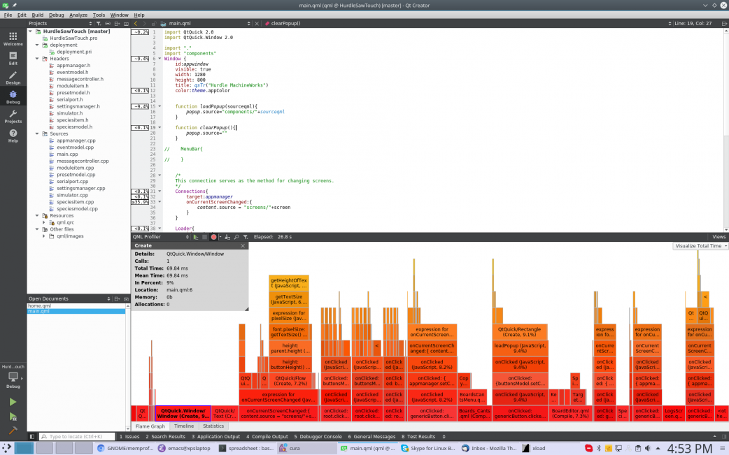 QML code runs in a just-in-time (JIT) compiled virtual machine, making it hard to relate results from a C++ profiler to the QML code level. Fortunately, Qt provides a QML profiler that retrieves QML performance data from an application. The easiest way to analyze the data is to use Qt Creator which has support for visualizing the results in various ways.
