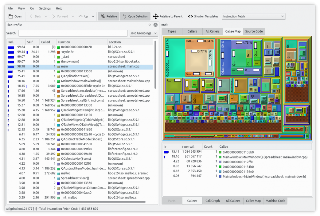 6,705,028 0 0 1,676,077 1,882 119 0 0 0 ???:QMetaObject::inherits(QMetaObject const*) constKCachegrind is a Qt-based tool (it is part of the open source KDE project) that allows you to graphically control and visualize the profiling output from Valgrind. Below is a screenshot showing some of the data generated by callgrind: