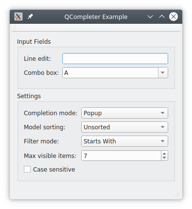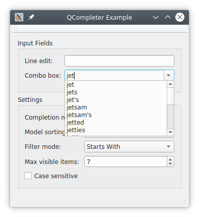 I wrote a simple example program that allows experimenting with QCompleter. It provides a line edit and combo box which are connected to a completer. You can change most of the completer properties from the UI and observe how the behavior changes. Below is a screen shot: