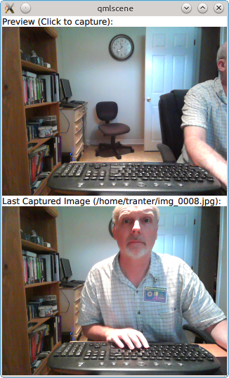 Here is a more complete example, which shows a preview, captures an image when the preview is clicked, and shows the most recent image captured.