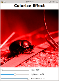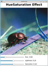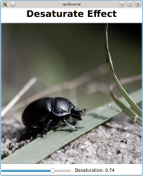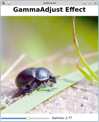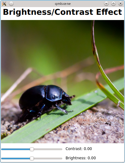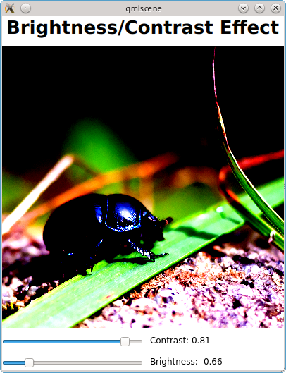To make it more interactive we will add some sliders to control the brightness and contrast. For this we can use the Slider element from the Qt Quick Controls (these come with Qt version 5.1.0 so you will need that version or later to run the example).