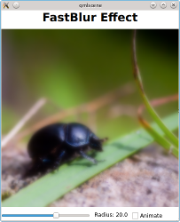 Here is a simple example taken straight from the Qt documentation. We use a FastBlur effect to operate on an image. The source is an Image which uses a file as a source. The source image is hidden. The effect operates on the source (by referencing it's id property).