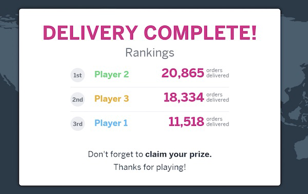 The game map allows the audience to watch the action on a large screen while the players are focused on their controller tablet. The game map includes both a map of the world and the paths the player have to complete in order to deliver their packages. We used the GPS coordinates of city airports to ensure all the cities are placed accurately on the map.