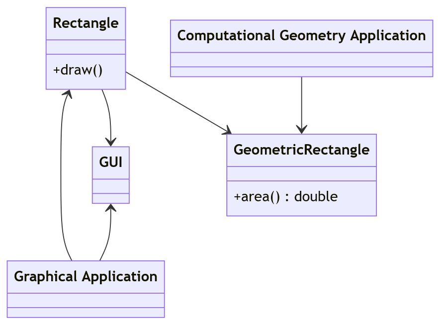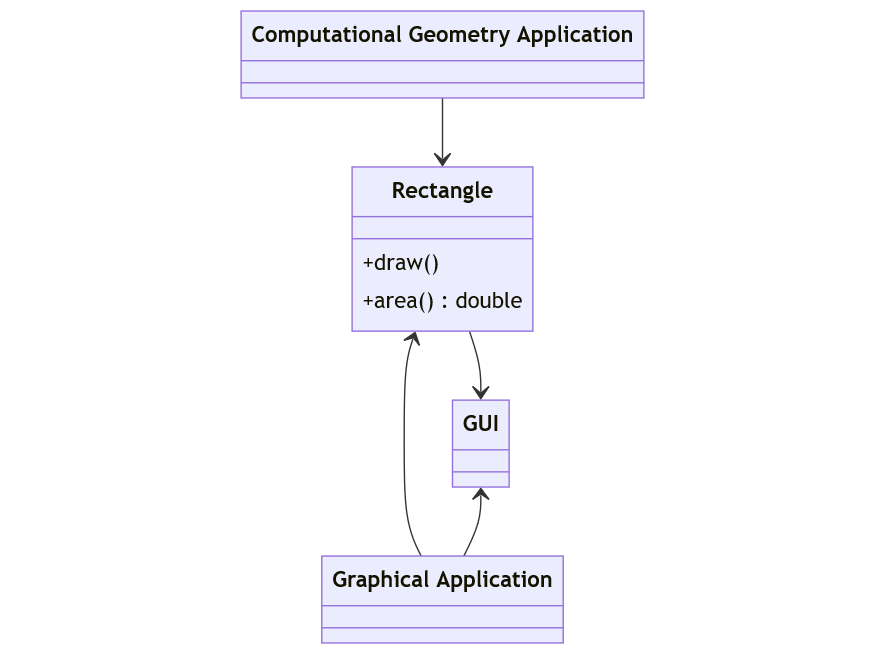 We have a class called Rectangle, which provides two public methods: draw() and area(). There are two applications, which use Rectangle for their own purposes. The Graphical Application makes use of the draw() function to render the rectangle. The Computational Geometry Application uses the area() function to perform some calculations. Because Rectangle deals with rendering it has a dependency on a GUI component, which is provided by some GUI library.