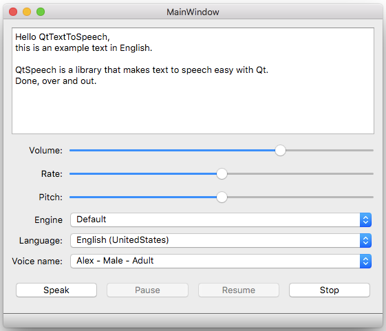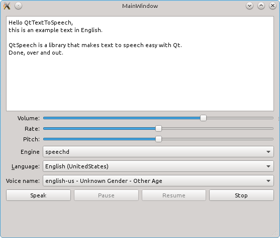 The Qt source includes a larger example located in <QTDIR>/examples/speech/hello_speak if you have installed Qt's examples. It allows setting most of the engine properties and entering text. Below are screen shots of the application running on the three desktop platforms.