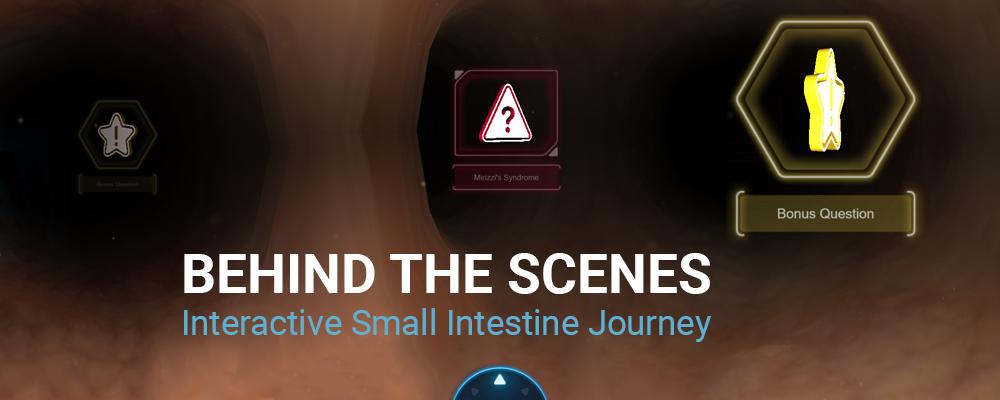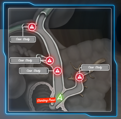 Our first iteration did not have a minimap, like the one below. As a result, early players didn’t understand that the goal of the game was to get to the case studies. They were too interested in simply navigating through the intestine. To solve that problem — after all, Boston Scientific’s goal was to educate players and test their knowledge — we created an interactive minimap that showed users exactly where they were, and which case studies they needed to navigate toward.