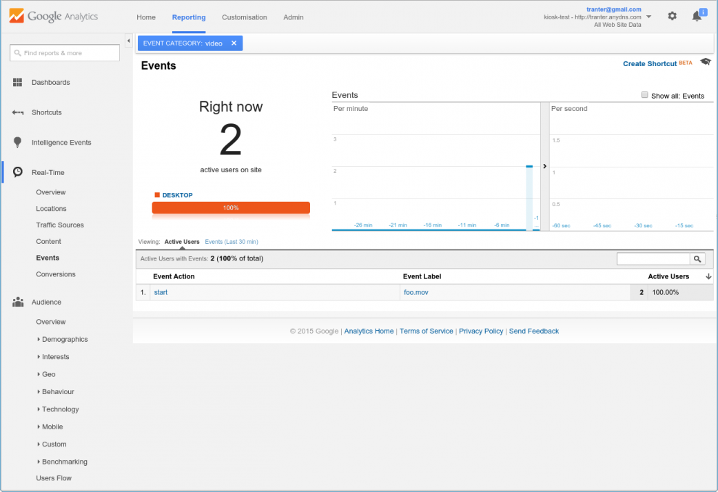 If the program is executing and some events have been sent, you should see the events show up in the Google Analytics web interface. The two screen shots below provide examples.