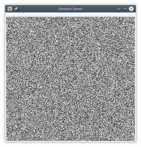 The program also displays the time required to generate a window of random data. This will typically vary depending on the random generator source. On my system it took about 110 milliseconds to generate the default 500x500 window. I encourage you to try this and the previous example on your system and see what results you get with different random generator sources.