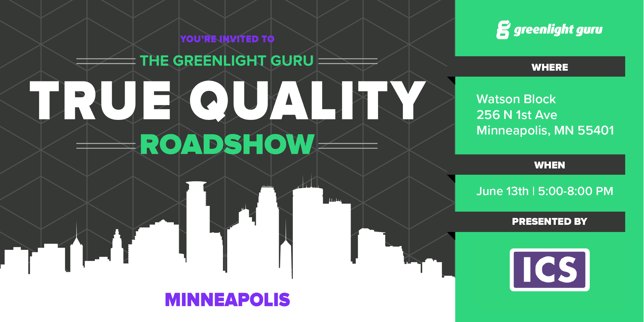 Join ICS, the team from Greenlight Guru, and Minneapolis' top medical device quality, regulatory, and engineering professionals for learning, networking, drinks, and hors d'oeuvres at the True Quality Roadshow on June 13. ICS is sponsoring and on the panel at this complimentary evening event. Find out more and register now!